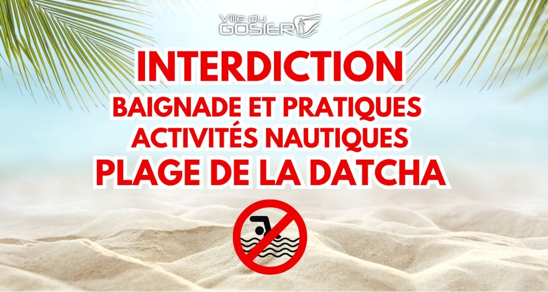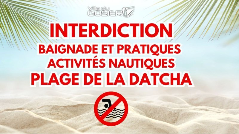 Le Maire du Gosier Michel HOTIN, informe la population et les visiteurs que la baignade et la pratique d’activités nautiques sont formellement interdites sur le site de la Datcha jusqu’à nouvel ordre.