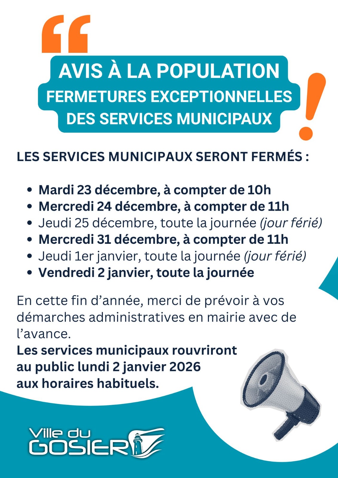 En raison des festivités de fin d’année, les services municipaux du Gosier seront exceptionnellement fermés d’après le calendrier ci-après :