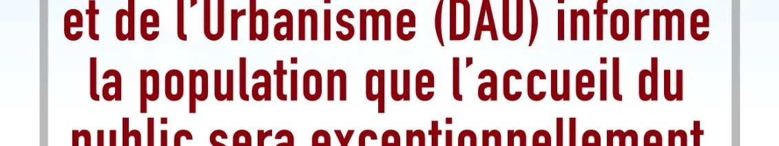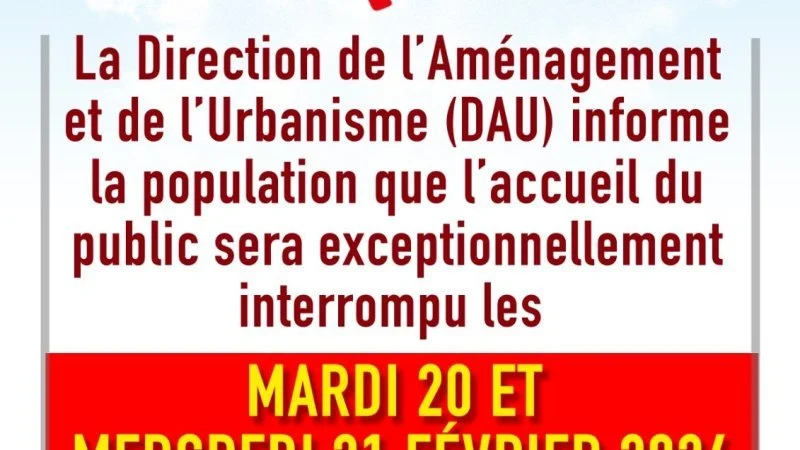 Nous vous informons que la Direction de l’Aménagement et de l’Urbanisme tient à vous aviser de l’interruption exceptionnelle de l’accueil du public les mardi 20 et mercredi 21 février 2024.