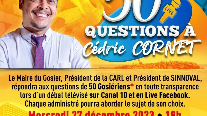 Le Maire du Gosier, Président de la CARL et Président de SINNOVAL, répondra aux questions de 50 Gosiériens* en toute transparence lors d’un débat télévisé sur Canal 10 et en Live Facebook. Chaque administré pourra aborder le sujet de son choix.