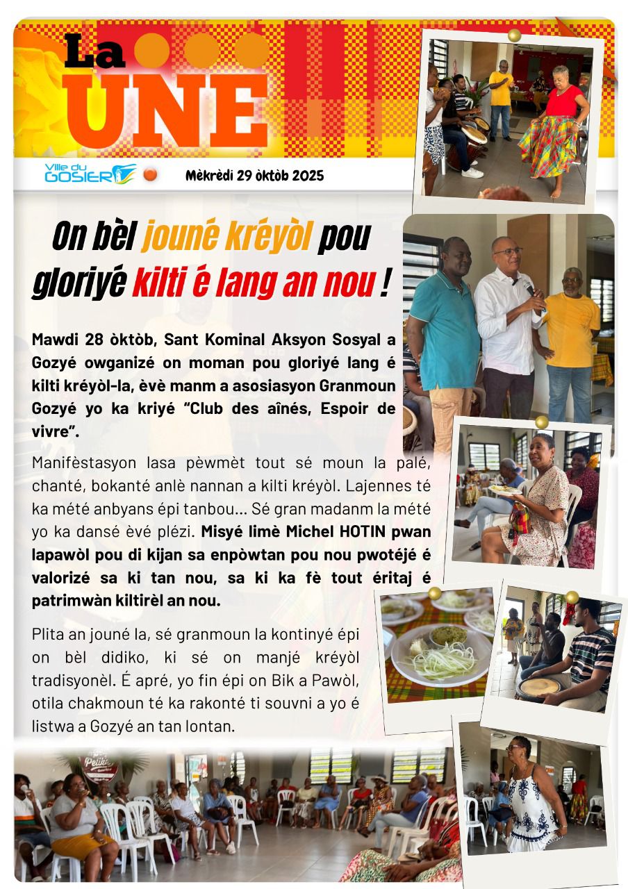 Ce mardi 28 octobre, le Centre Communal d’Action Sociale (CCAS) du Gosier a organisé une matinée consacrée au créole, réunissant les membres du Club des Aînés autour de la langue et de la culture locale. Au son du ka, les participants ont été invités à entrer dans l’ambiance de la matinée, avant que Michel Hotin, président du CCAS, ne prenne la parole pour rappeler l’importance de la préservation et de la valorisation de ce patrimoine culturel. La matinée s’est poursuivie avec le partage du