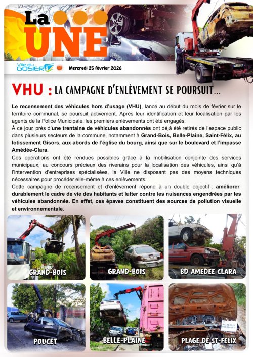 Après leur identification et leur localisation par les agents de la Police Municipale, les premiers enlèvements ont été engagés. À ce jour, près d’une trentaine de véhicules abandonnés ont déjà été retirés de l’espace public dans plusieurs secteurs de la commune, notamment à Grand-Bois, Belle-Plaine, Saint-Félix, au lotissement Gisors, aux abords de l’église du bourg, ainsi que sur le boulevard et l’impasse Amédée-Clara.