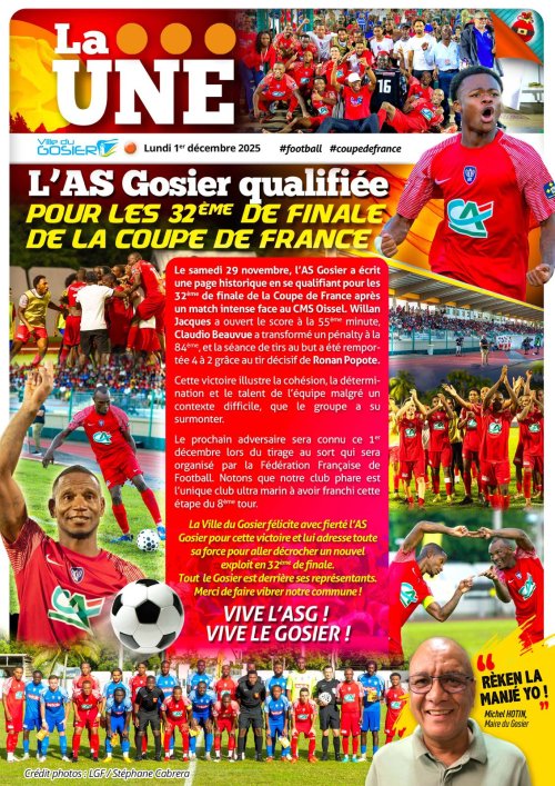 La UNE du 1er décembre L’AS Gosier qualifiée pour les 32 ème de finale de la Coupe de France Crédit Agricole