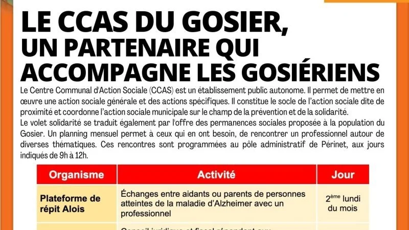 Le volet solidarité se traduit également par l’offre des permanences sociales proposée à la population du Gosier. Un planning mensuel permet à ceux qui en ont besoin, de rencontrer un professionnel autour de diverses thématiques. Ces rencontres sont programmées au pôle administratif de Périnet, aux jours indiqués de 9h à 12h.