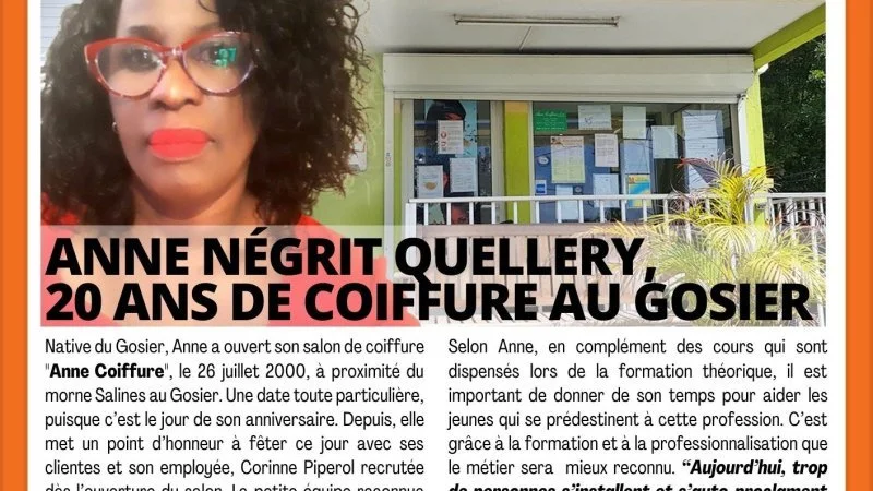 Native du Gosier, Anne a ouvert son salon de coiffure "Anne Coiffure", le 26 juillet 2000, à proximité du morne Salines au Gosier. Une date toute particulière, puisque c’est le jour de son anniversaire. Depuis, elle met un point d’honneur à fêter ce jour avec ses clientes et son employée, Corinne Piperol recrutée dès l’ouverture du salon. La petite équipe reconnue pour son professionnalisme et son sérieux accueille les clientes, bien plus nombreuses que les clients, dans un univers apaisant où elles se sentent bien et valorisées. Elle prend soin des cheveux des clientes, qu’ils soient naturels ou transformés. “Mes clientes sont mes reines. Je ferai tout pour répondre à leur demande, les conseiller dans leurs choix capillaires et faire en sorte qu’elles passent un bon moment au salon. Si elles n’étaient pas là, je n’aurais pas pu travailler.”