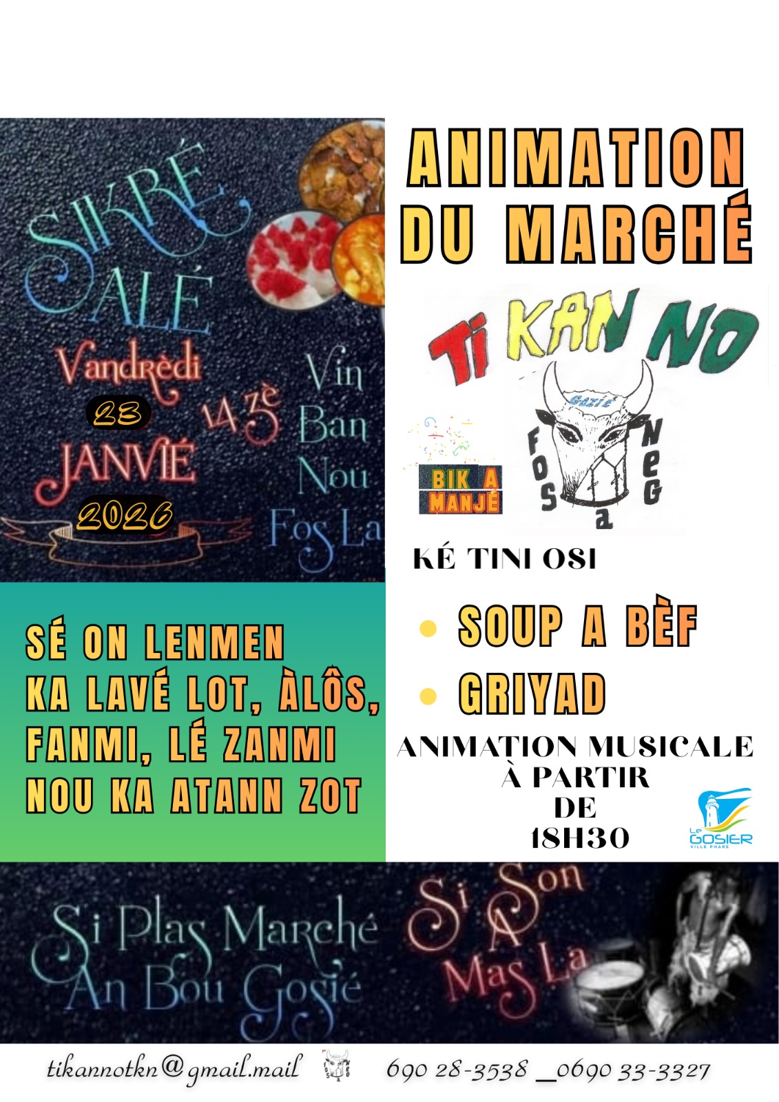 Le vendredi 23 janvier 2026, le groupe Ti Kan’No vous donne rendez-vous sur le marché agricole du Gosier pour une foire sucré-salé placée sous le signe de la convivialité et du partage.