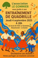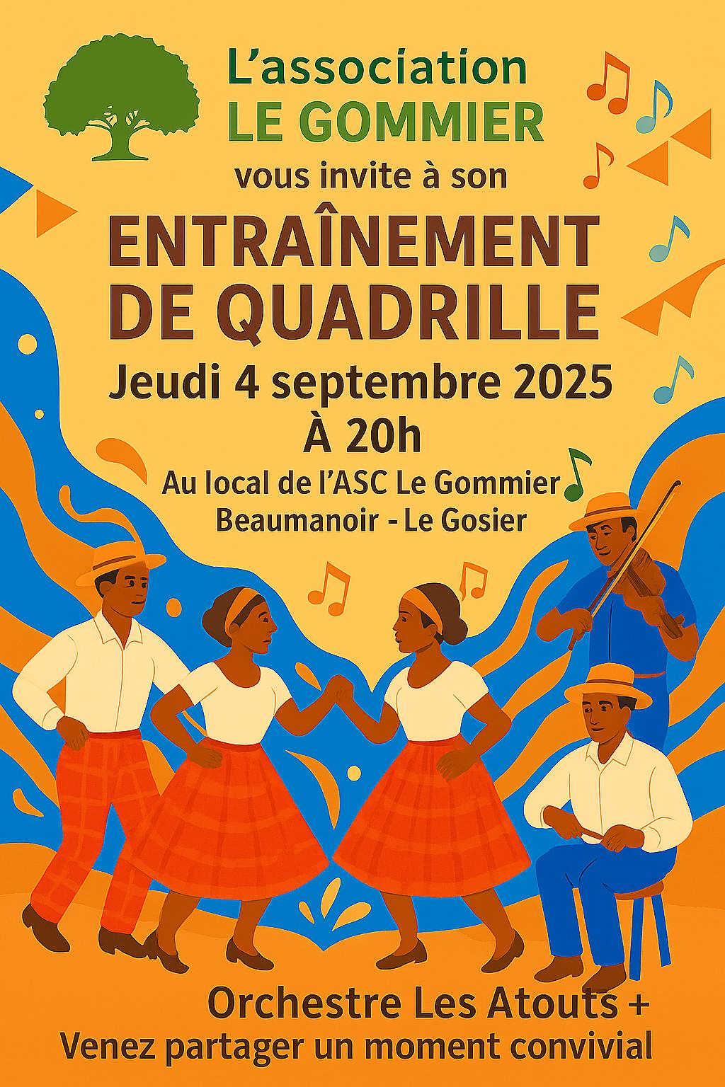 L’association Le Gommier invite les amoureux de quadrille à participer à un entraînement de danse quadrille qui se tiendra jeudi 4 septembre 2025 à partir de 20h au local de l’association Le Gommier, à Beaumanoir, au Gosier.