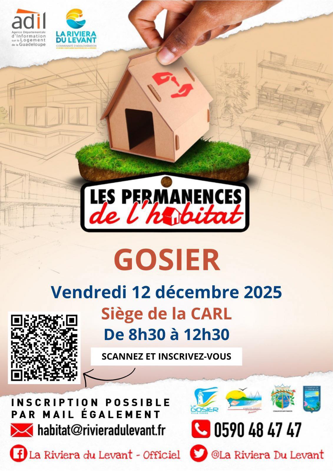 Présentez-vous à la permanence de l’habitat du Gosier qui se tiendra le vendredi 12 décembre 2025 de 8h30 à 12h30 au siège de la CARL, boulevard du Général de Gaulle au bourg du Gosier.