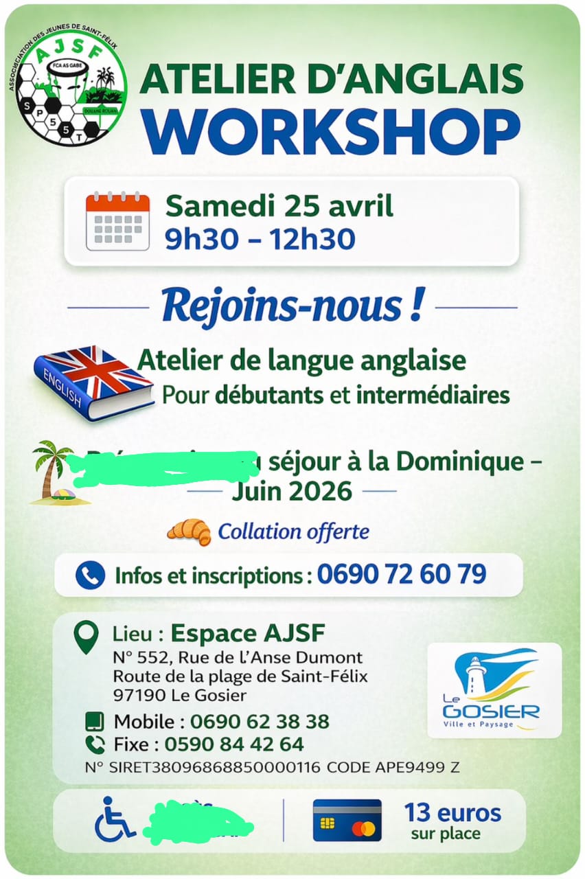 L’AJSF organise un atelier de langue anglaise pour débutants et intermédiaires, le samedi 25 avril de 9h30 à 12h30 au local de l’association à Saint-Félix, route de la plage.