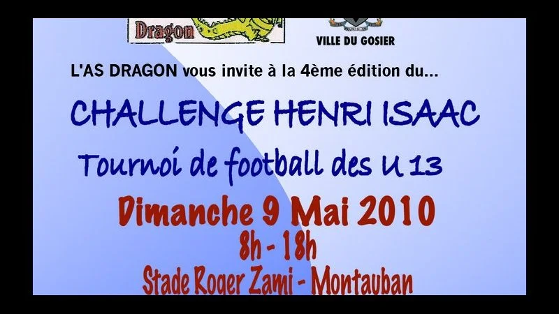 L’AS DRAGON, Club phare de football du Gosier, organise la 4ème édition du Challenge Henri Isaac, Dimanche 9 mai 2010 de 8h à 18h au Stade Roger Zami de Montauban.
