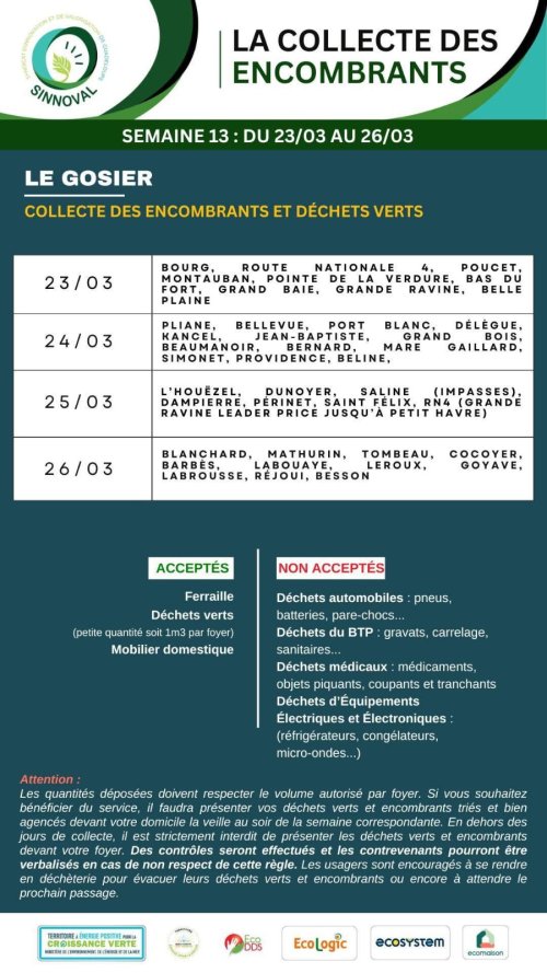 Secteurs collectés : L’Houëzel, Dunoyer, Saline (impasses), Dampierre, Périnet, Saint-Félix, RN4 de Grande-Ravine Leader Price jusqu’à Petit-Havre