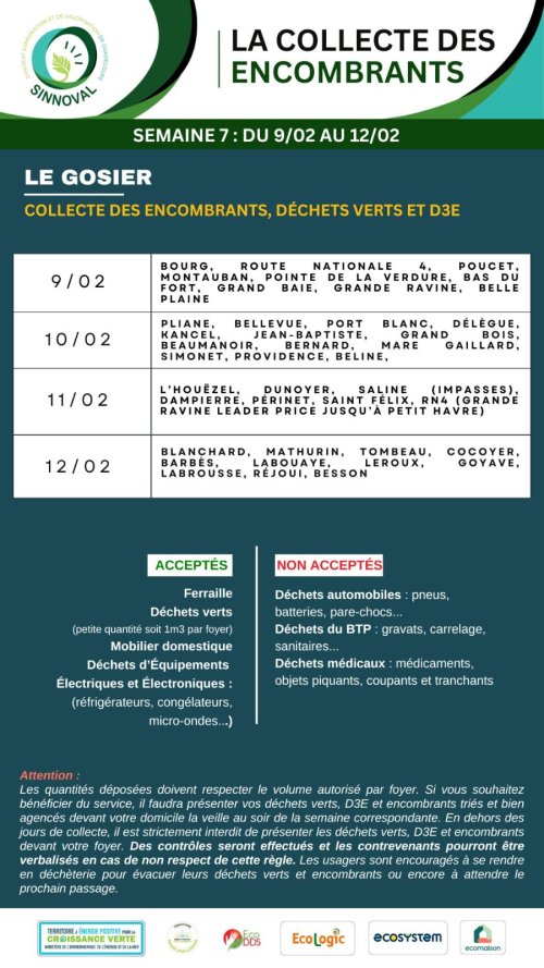 Attention ! Les quantités déposées doivent respecter le volume autorisé par foyer. Si vous souhaitez bénéficier du service, il faudra présenter vos encombrants, déchets verts et D3E, triés et bien agencés devant votre domicile la veille au soir de la semaine correspondante. En dehors des jours de collecte, il est strictement interdit de présenter les déchets devant votre foyer. Des contrôles seront effectués et les contrevenants pourront être verbalisés en cas de non respect de cette règle. Les usagers sont encouragés à se rendre en déchèterie pour évacuer leurs déchets ou encore attendre le prochain passage.