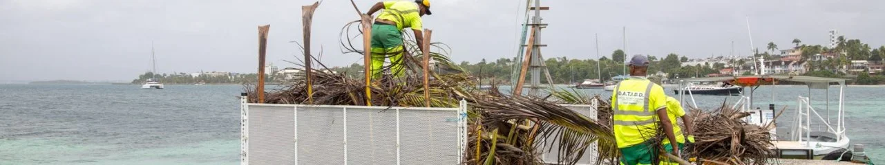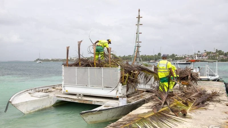Ce mercredi 30 septembre, 12 agents et leurs encadrants étaient à pied d’œuvre sur l’îlet pour ramasser les déchets verts engendrés par la précédente opération de nettoyage et d’élagage. “Régulièrement, il faut élaguer et gérer la prolifération des espèces non endémiques, comme les cocotiers qui représentent un danger pour les touristes et les usagers du site. Nous avons donc enlevé toutes les noix de coco et élagué les palmes”, précise la directrice. Les cocos ont été broyés sur place grâce à la broyeuse de la commune. Les végétaux broyés serviront ainsi de compost en arrière plage, pour enrichir le milieu et éviter les contraintes logistiques dues à la double insularité. Les feuilles de palmiers quant à elles, sont stockées dans des bennes et chargées sur une barge de location mise à disposition par l’entreprise Forboat SARL, accostée au ponton de l’îlet pour la journée. Elles sont ensuite acheminées vers un centre de de traitement des déchets verts agréé.
