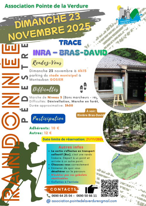 Cette sortie, de niveau 3, s’adresse à de bons marcheurs. Elle comprend du dénivelé, une marche en forêt et une durée estimée de 3 heures. Les participants pourront notamment découvrir la rivière Bras-David.