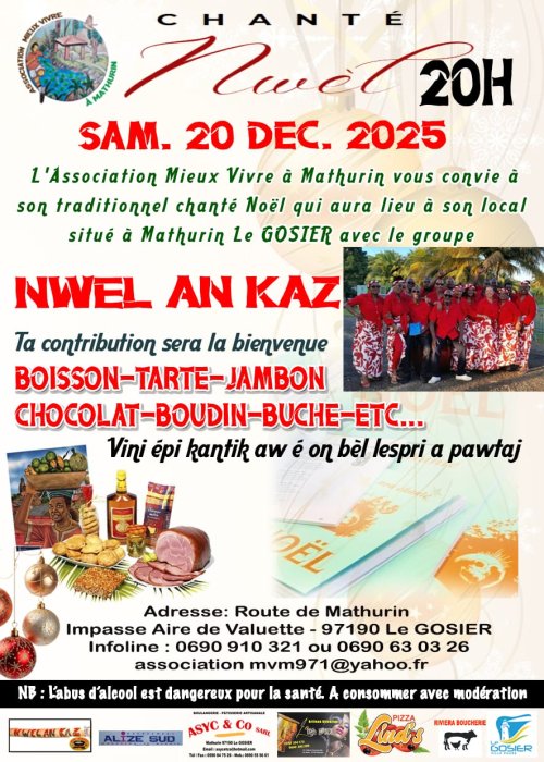 Impasse, Aire de Valuette, Mathurin le GosierL’association Mieux Vivre à Mathurin vous invite à son traditionnel Chanté Nwèl le samedi 20 décembre animé par le groupe Nwèl an Kaz !...
