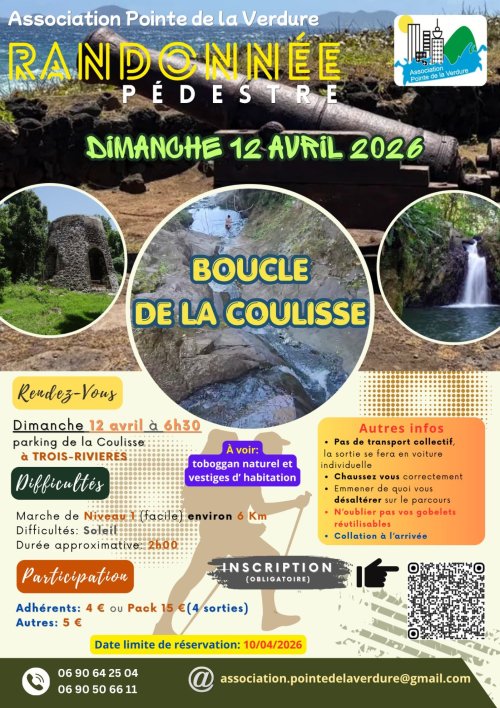 Le rendez-vous est fixé au dimanche 12 avril 2026 à 6h30, sur le parking de la Coulisse à Trois-Rivières. Cette randonnée accessible, d’environ 6 km, est prévue pour une durée d’environ 2 heures et s’adresse à un niveau facile, idéal pour profiter pleinement du parcours en toute convivialité. Au fil du trajet, vous aurez l’occasion de découvrir un toboggan naturel ainsi que des vestiges d’habitation, témoins du passé et intégrés dans un cadre naturel remarquable.