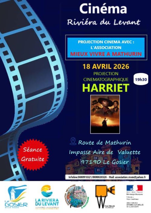 La projection aura lieu le samedi 18 avril 2026 à 19h30, sur la Route de Mathurin, Impasse Aire de Valuette au Gosier. À l’affiche de cette soirée : le film Harriet, une histoire inspirante et marquante à découvrir ou redécouvrir.